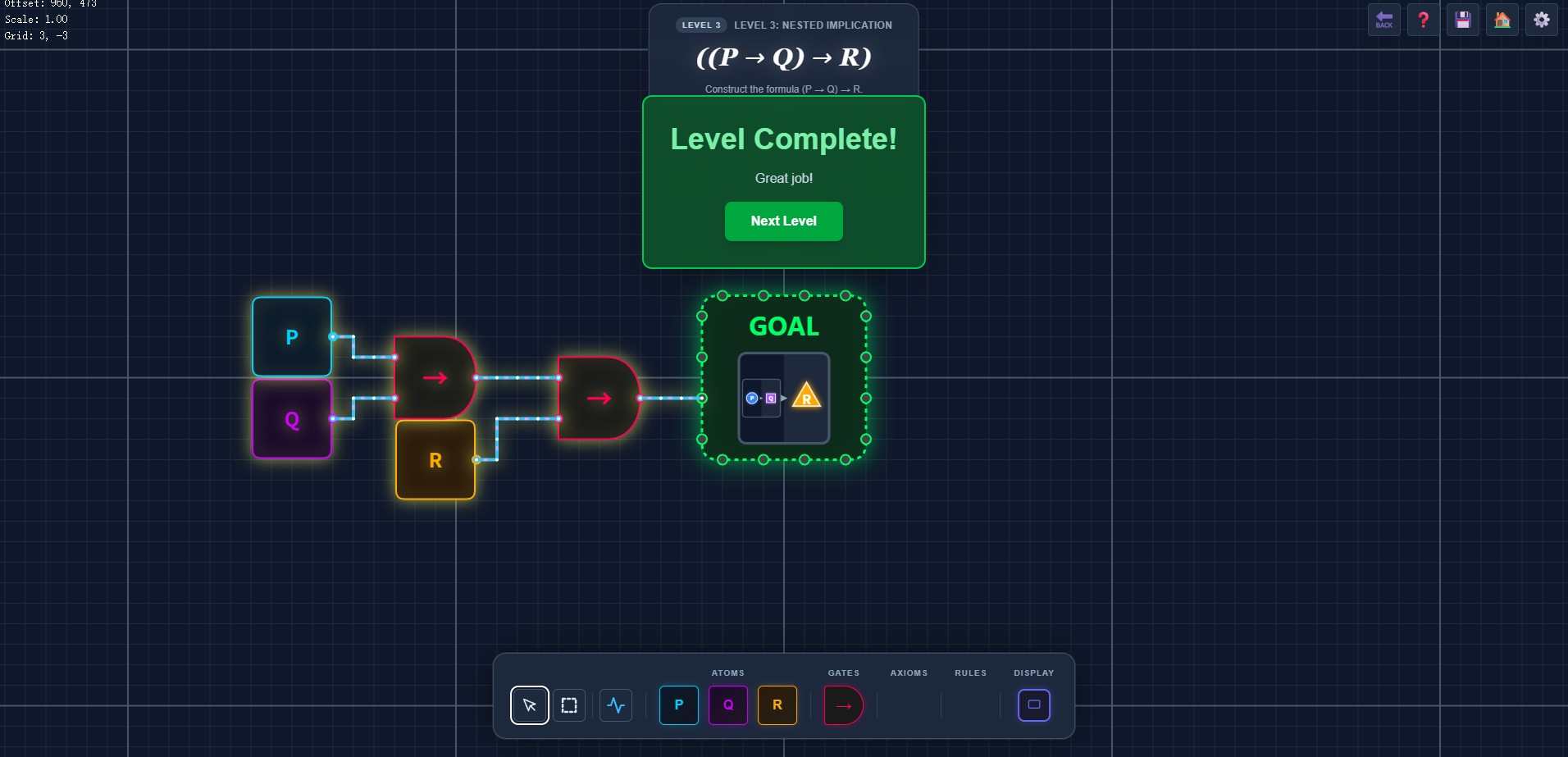 In Logic Circuits, you will use circuits to make various formula signals. Light up the goal to beat the game!